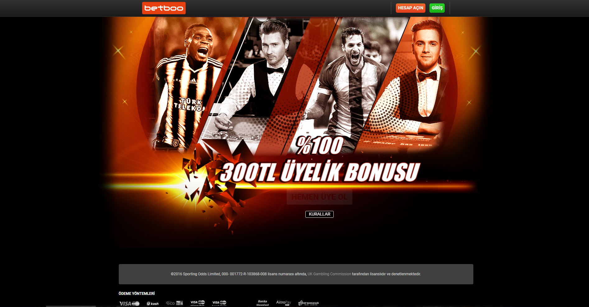 Betboo bahis sitesine ilk kez üye olacaklara büyük fırsat sunmaktadır. Aslında birçok bonus fırsatı sunmaktadır. Bu fırsatlar arasında siteye yeni üye olan bahis sever kullanıcılarına 300 TL Hoş Geldin bonusu vermektedir. Betboo bahis sitesinde bahis oynamak ve kupon yapmak için ise sitede açmış olduğunuz hesaba para yatırmanız gerekmektedir. İlk kez para yatıracak bahis sever kullanıcılarına betboo bahis sitesinin vermiş olduğu büyük bonuslardan biride ilk kez yatırmış olduğunuz paraya yüzde 100 bonus vermektedir. Sitenin vermiş olduğu maksimum bahis tutarı 300 TL’dir. Verilen bonusları kullanabileceğiniz alanlar spor bahisleri, sanal spor bahisleri ve casino da almış olduğunuz bonusları çevirebilmektesiniz. Ayrıca casino da bonuslar 35 katına çıkarılmıştır.