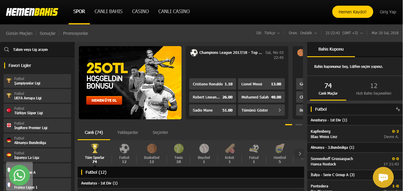Vermiş olduğu hizmetlerin kalitesi ile bahis severlerin gönlünü kazanan Hemenbahis sitesi, son derece şık bir web tasarımı ile kullanıcılarını karşılamaktadır. Site içerisinde yaşanan herhangi bir durum için bahis severlerin iletişime geçebileceği ve anında tüm sorularına yanıt verebileceği bir canlı destek hizmeti Hemenbahis sitesinde yer almaktadır. 7 gün 24 saat hizmet vermekte olan bu canlı destek hattının yanı sıra Whatsapp destek hattı da bulunmaktadır.