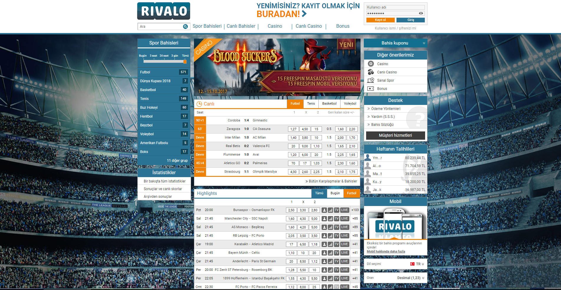 Rivalo bahis sitesi belirtilen maçları ve oranların yüksek olması ile daha iyi bir kupon yapma olanağı sağlamaktadır. Birçok yeni özellik barındıran bahis seçenekleri ile canlı olarak maç boyunca bahis yapabilme avantajı sağlamaktadır.